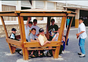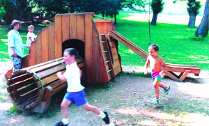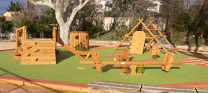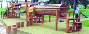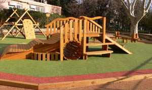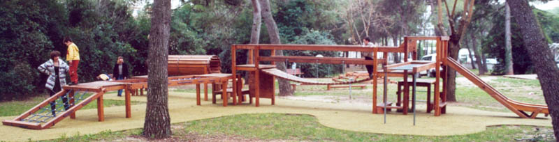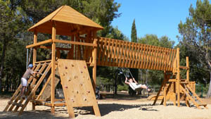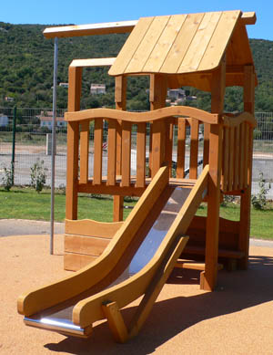 Constructions solides La quincaillerie d’assemblage est en inox ou galvanisée. Les boulons et les tire-fonds sont entièrement enfoncés dans le bois et couverts par des caches. Les tubes métalliques sont galvanisés, avec un diamètre de 30 mm pour les échelles et de 40 mm pour les tubes plus longs. Les toboggans sont en inox d’une épaisseur de 1,5 mm. Le cordage en nylon a une âme métallique, résistant à l’usure, au vandalisme et présente un toucher agréable.
