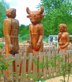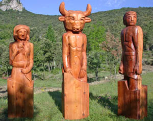 Totems sur le thème du Minotaure avec Ariane et Thésée